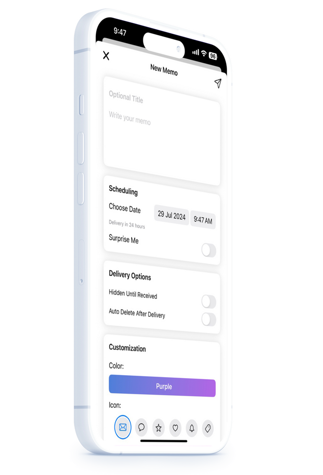 Craft personalized memos to your future self with ease. Set custom unlock dates, add a photo, and set your own relevant icon. Whether it's a goal reminder, a word of encouragement, or a captured moment, MemoVault helps you send it forward in time. Your thoughts, securely preserved and delivered when you need them most.
